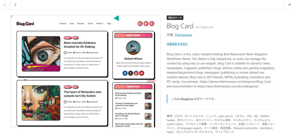 テーマは「Blog Card」っていうのにした。あとは申し訳程度のCSS知識で追加CSS書いたよ。