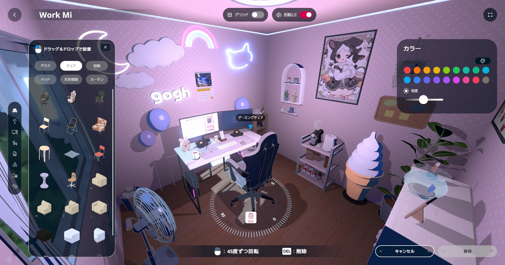 アバターの次は、作業部屋を作ることになる。勉強のお供となるデスクやチェア、照明などの設備はもちろん、100種類以上の様々な家具が部屋に彩りを加えてくれる。