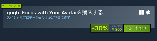 上述の高品質アバター、部屋カスタマイズ、音楽、全部併せてお値段は定価1,380円。この時点でも十分すぎるほど安いんだけど、セールでなんと1,000円切りになることも。