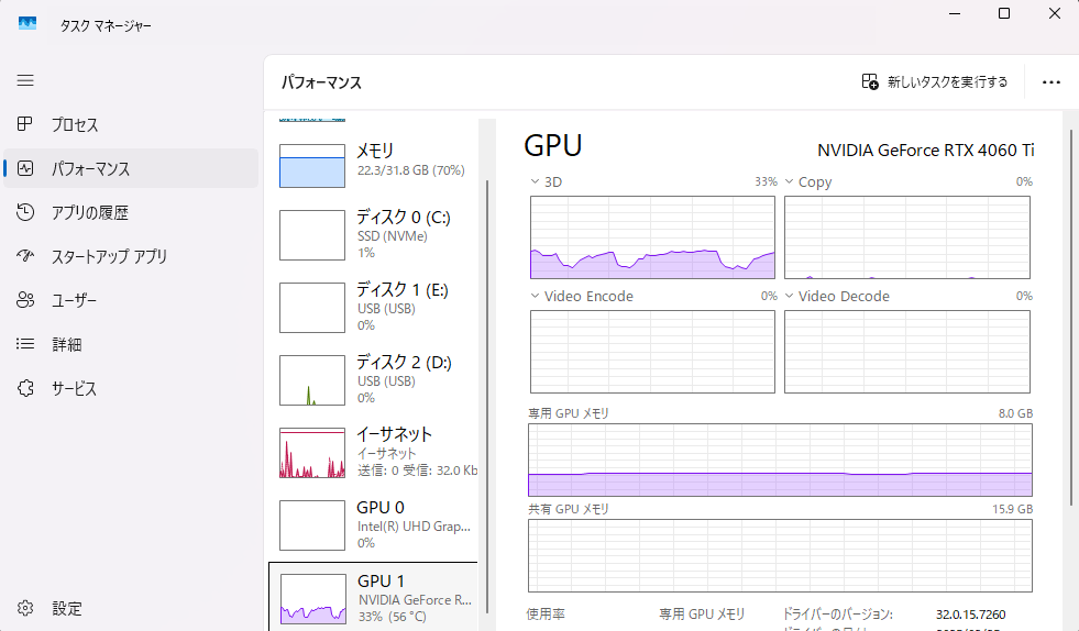メモリは500MB前後、GPU負荷もだいたい20~30%で安定。私の用途だと十分実用範囲内。