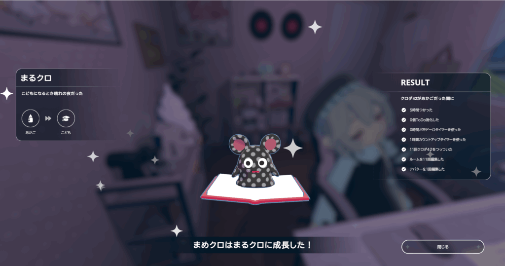 『gogh』は育成要素も実装されている。クロダ42というキャラクターで、一緒にいる間、どんなタイマーを何時間使ったか、どれくらいクロダ42に構ってあげたかなど、様々な要素に応じて成長。