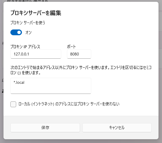 WIndowsの「設定」>「ネットワークとインターネット」>「プロキシ」>「プロキシサーバーを使う」からできる。プロキシIPアドレスは「127.0.0.1」、ポートは「8080」としたよ。