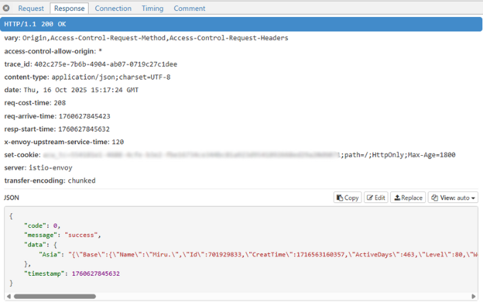 "Asia": "{\"Base\":{\"Name\":\"Miru.\",\"Id\":701929833,\"CreatTime\":1716563160357,\"ActiveDays\":463,\"Level\":80,\"WorldLevel\":8,\"RoleNum\":21,\"SoundBox\":10,\"Energy\":240,\"MaxEnergy\":240,\"StoreEnergy\":381,\"StoreEnergyRecoverTime\":1760704845418,\"EnergyRecoverTime\":0,\"Liveness\":0,\"LivenessMaxCount\":100,\"LivenessUnlock\":true,\"ChapterId\":18,\"WeeklyInstCount\":3,\"Boxes\":{\"2\":753,\"1\":889,\"3\":302,\"4\":62},\"BasicBoxes\":{\"2\":631,\"1\":539,\"3\":298,\"4\":78},\"PhantomBoxes\":{\"2\":144,\"1\":184,\"3\":116},\"BirthMon\":0,\"BirthDay\":0},\"BattlePass\":{\"Level\":6,\"WeekExp\":2600,\"WeekMaxExp\":12000,\"IsUnlock\":true,\"IsOpen\":true,\"Exp\":400,\"ExpLimit\":1000}}"