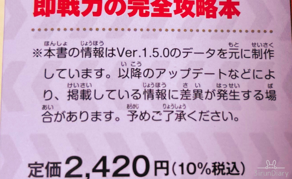 ゲームの方で、攻略本発売3日前の3月31日にVer.1.6.0が配信されたんだけど、攻略本の情報はVer.1.5.0時点のもの。ごく最近のアップデートが反映されていないのはやっぱり残念。
